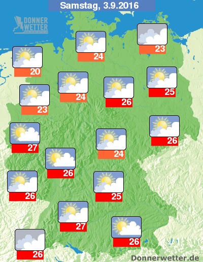 Am Samstag ist es besonders über Norddeutschland häufig stark bewölkt, verbreitet heiter zeigt sich das Wetter hingegen über dem Süden. In den weiteren Landesteilen ist es locker bis aufgelockert bewölkt, es bleibt landesweit trocken. Die Temperatur steigt auf 20 Grad in Bremerhaven und bis 27 Grad in Stuttgart.