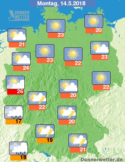 In der Südhälfte oft wolkenverhangen und wiederholt Regengüsse und örtliche Gewitter. In der Mitte bei wechselnd bewölktem Himmel trocken. In der Nordhälfte durchgehend sonnig. Höchstwerte zwischen 16 Grad am Alpenrand und 27 Grad im Norddeutschen Tiefland, sowie am Niederrhein. Meist mäßiger, in der Mitte und im Osten vorübergehend böig auffrischender Wind aus Ost bis Nordost. Im Süden von Gewitterböen abgesehen schwachwindig.