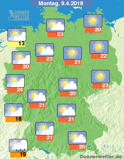 Vor allem im Nordosten strahlt nochmals ungehindert die Sonne. Sonst ziehen vermehrt hohe und mittelhohe Wolkenschleier am Himmel vorüber. Im Tagesverlauf können sich am Oberrhein, sowie an der Grenze zu Benelux aus mächtigeren Haufenwolken örtliche Regengüssen und Gewittern entladen. Im übrigen Land sollte es trocken bleiben. Die Höchsttemperaturen erreichen nochmals verbreitet 18 bis 25 Grad, wesentlich kühler bleibt es im direkten Küstenumfeld von Nord- und Ostsee. Der Wind weht meist nur schwach. Lediglich in der Nähe von Schauern kann er böig auffrischen. In der Nacht auf Dienstag kann es im Südwesten stellenweise etwas regnen.