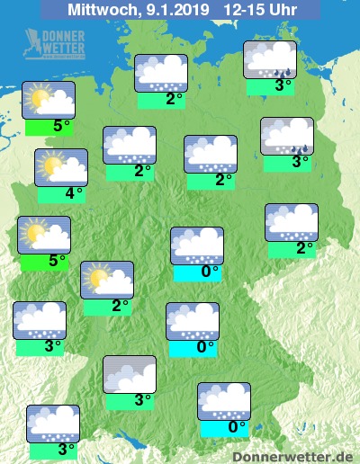 Am Nachmittag fällt vor allem in der Osthälfte und im Süden noch zeit- und gebietsweise Schnee oder Schneeregen, im Nordstau der Berge, sowie an den Alpen auch kräftig. Besonders in höheren Lagen muss mit winterlichen Straßenverhältnissen gerechnet werden. Im Westen werden die Niederschläge immer seltener und die Bewölkung lockert teilweise auf. Insbesondere am Niederrhein und an der Ems scheint die Sonne auch für längere Zeit.