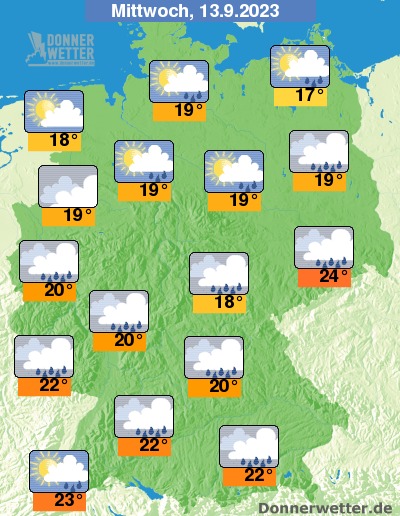 Am Mittwoch ist es aufgelockert bis stark bewölkt. Es bilden sich besonders über der Südhälfte, in der ersten Tageshälfte auch im Osten zeitweise Schauer. Im weiteren Verlauf wird es über dem Norden oft sonnig. Die Temperatur erreicht 17 Grad in Rostock und bis 24 Grad in Dresden.