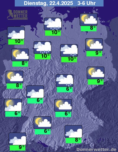 In der Nacht zum Dienstag bringen dichte Wolken vor allem im Norden gebietsweise Schauer. Im übrigen Land sind ebenfalls dichte Wolken möglich, der Himmel lockert aber auch über weiten Landesteilen auf, dazu bleibt es meist trocken. Die Temperatur sinkt auf 10 Grad in Hamburg und bis etwa 6 Grad in Nürnberg.