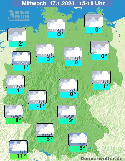 Am Nachmittag und Abend bleibt der Himmel meist stark bewölkt oder es ist bedeckt, dabei muss in weiten Landesteilen mit Niederschlägen gerechnet werden. Auf der Nordseite der Luftmassengrenze, die in etwa auf einer Linie von der Eifel bis in nach Sachsen verläuft, fallen teils ergiebige Schneefälle. Vor allem in den Übergangsbereichen und auf der Südseite besteht durch gefrierenden Regen extreme Glättegefahr.