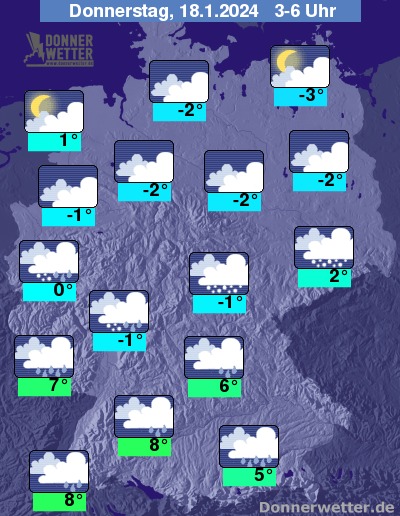 Die Temperaturen erreichen am Nachmittag Höchstwerte um -1 Grad im Rhein-Main-Gebiet, 5 Grad an den Alpen und 11 Grad am Oberrhein.