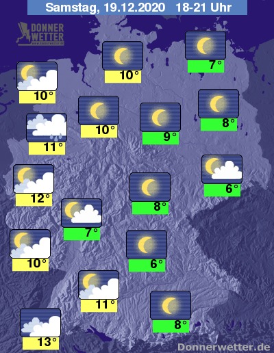 In der Nacht zum Sonntag zeigt sich der Himmel über der Osthälfte des Landes meist locker bis wechselnd bewölkt, nach Südosten hin mehrheitlich sogar sternenklar, dazu bleibt es trocken, stellenweise ist Nebel möglich. Weiter nach Westen hin halten sich dichte Wolken und im Westen und Südwesten fällt gebietsweise Regen, sonst bleibt es trocken. Die Temperatur sinkt auf 9 Grad im Oberrheingraben und -1 Grad in Berchtesgaden.