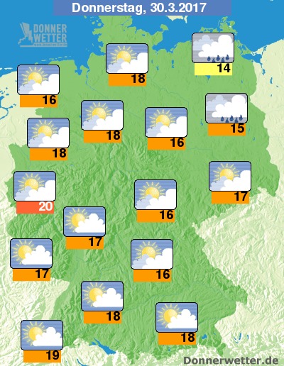 Am Donnerstag morgen steigen die Temperaturen wieder rasch an. Weitgehend in jeder Region über Deutschland zeigt sich die Sonne zeitweise über dem Himmel. Ausgenommen sind die Ostseeküste und die Hauptstadt Berlin, wo es höchstwahrscheinlich noch zu etwas Regen kommen wird. Die Temperaturen liegen bei Werten um 14 Grad C und 20 Grad C in der Eifel.