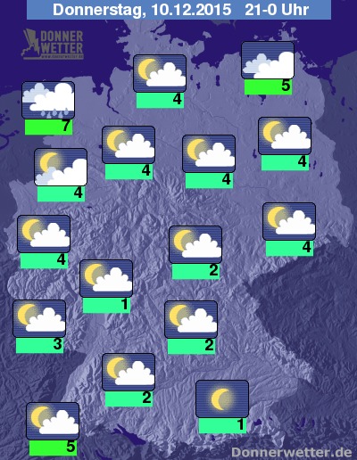 In der Nacht zum Freitag breiten sich die dichten Regenwolken weiter südostwärts aus und erreichen bis zum Morgen etwa eine Linie von NRW, über das südöstliche Niedersachsen bis nach Vorpommern. Südöstlich davon ist es zunehmend stärker und gegen Morgen auch oft dicht bewölkt, jedoch trocken. Im Süden des Landes sowie in Sachsen ist es zunächst meist locker bewölkt, aber auch hier ziehen zum Morgen mehr Wolken auf, dabei bleibt es aber noch weitgehend aufgelockert bewölkt und ebenfalls trocken. Die Tiefstwerte liegen bei 6 Grad in Emden und etwa 0 Grad am Westerwald.