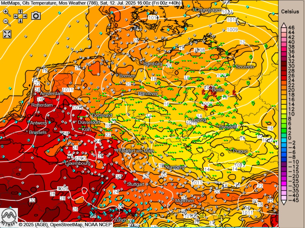 Am Samstagnachmittag breitet sich dichte Bewölkung von Osten und Nordosten bis in die Landesmitte aus, dabei muss immer wieder mit teils schauerartigem Regen gerechnet werden. Im Osten sind am Nachmittag zudem einzelne kräftige Gewitter mit Starkregen im Gepäck möglich. Im Süden und Südwesten bleibt es bei einem freundlichen Mix aus Sonne und Wolken niederschlagsfrei.