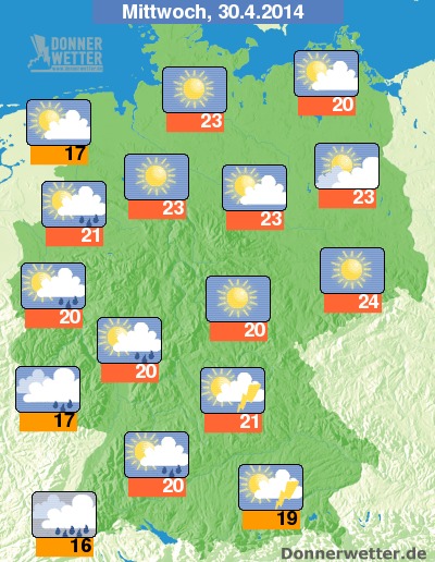 Kurzwetter am MittwochIm äußersten Nordosten heiter oder sonnig, teils locker bewölkt und meist trocken. Sonst Sonne und Wolken im Wechsel, immer wieder auch örtliche Schauer und Gewitter möglich. Höchstwerte um 19 Grad in Bayern und bis 24 Grad in Berlin.