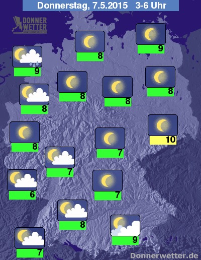 In der Nacht zum Donnerstag ist es im Nordwesten, Westen, Südwesten und im äußeren Süden häufig aufgelockert bis stark bewölkt, dazu fällt aber nur selten etwas Regen. Im übrigen Bundesgebiet zeigt sich hingegen ein weitgehend sternenklarer Nachthimmel und es bleibt trocken. Die Temperatur sinkt auf 10 Grad in Niederschlesien und bis 6 Grad am Pfälzer Wald.