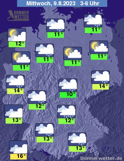 In der Nacht zum Mittwoch zieht zeitweise kompakte und teils aufgelockerte Bewölkung durch, es bilden sich gebietsweise Schauer. Die Temperatur sinkt auf 16 Grad in Freiburg und bis etwa 10 Grad in Jena. An der See weht ein verbreitet stürmischer Wind, vor allem an der Nordsee mit vielerorts Sturmböen.