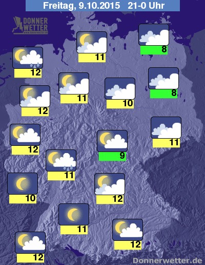 Heute Abend halten sich über dem Osten und Nordosten meist dichte Wolken, im Süden und Südwesten zeigt sich der Himmel hingegen überwiegend locker bewölkt oder sternenklar. In den übrigen Landesteilen gibt es einen Wechsel aus teils lockerer und teils auch stärkerer Bewölkung. Bei Abendtemperaturen zwischen 12 Grad am Niederrhein und etwa 8 Grad an der Müritz bleibt es fast landesweit trocken. Nur im Nordseeküstenumfeld und gebietsweise im westdeutschen Raum ist Regen möglich.