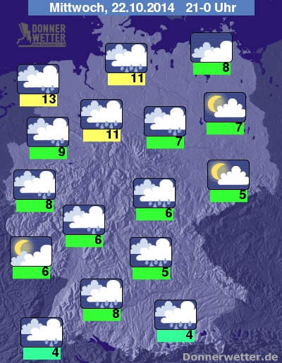 Am Nachmittag ziehen häufig dichte Wolken durch, die für teils kräftige, und vor allem im Osten und Süden auch langanhaltende Regenfälle sorgen. Im Westen, aber gebietsweise auch im Norden lockert die Bewölkung meist etwas auf, es können sich jedoch weitere, teils kräftige Schauer entwickeln. Dazu weht im Flachland ein frischer bis starker Wind mit regional stürmischen Böen. Auf den Bergen und an der Nordsee weht der Wind meist stark bis stürmisch, dabei sind auch schwere Sturmböen möglich. Die Temperatur liegt bei teils nur noch 5 Grad am Alpenrand und bei 14 Grad an der Nordsee.
