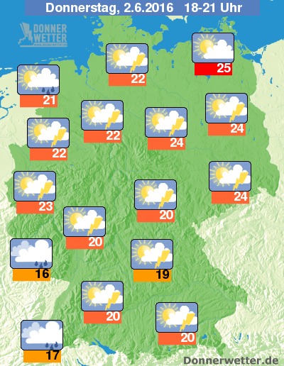 Etwas ruhiger oder mit einer geringerer Gewittergefahr kommt der Südwesten, der Alpenrand sowie weite Teile Ost- und Nordostdeutschlands davon.
