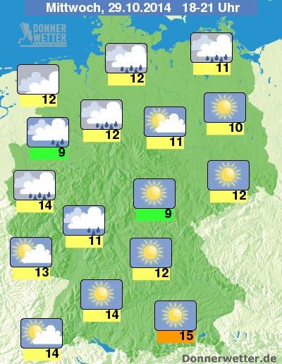 Die Temperaturen am Abend liegen bei Werten um 9 Grad C im Thüringer Wald und um 15 Grad am Alpenrand.