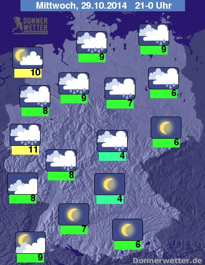 Am späten Abend geht es in der Nordwesthälfte mit Schauern weiter, häufig wolkenfrei geht es dagegen im Süden sowie entlang des Erzgebirges zu. Tiefstwerte dann um 11 Grad im Rheinland und um 4 Grad in den Mittelgebirgen.