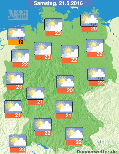 Die Temperaturen erreichen eher noch verhaltene 14 Grad C in Ostfriesland und um 21 Grad C in Dresden.