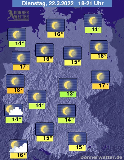Heute Abend ist der Himmel weitgehend sternenklar, entlang des Rheins sind hier und da ein paar Wolken möglich. Die Abendwerte liegen bei 13 Grad in Erfurt und bis 18 Grad in Köln.