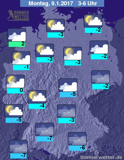 In der Nacht zum Montag ist es im Norden und Westen oft locker oder aufgelockert bewölkt. Im übrigen Land ist es zum Großteil neblig-trüb oder stark bewölkt, jedoch bleibt es auch hier weitgehend trocken. Die Temperatur sinkt auf 2 Grad an der nördlichen Ems und bis -7 Grad im Kraichgau.
