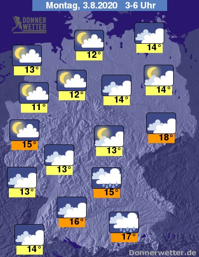 In der folgenden Nacht fällt südöstlich einer Linie vom Bodensee bis zum Erzgebirge zum Teil kräftiger und langanhaltender Regen. Weiter nach Nordwesten hin ist es zwar verbreitet stark bewölkt, jedoch weitgehend trocken. Im Norden und Westen ist es meist locker bis aufgelockert bewölkt und dazu trocken. Die Temperatur sinkt auf 18 Grad in Dresden und bis 11 Grad im Münsterland.