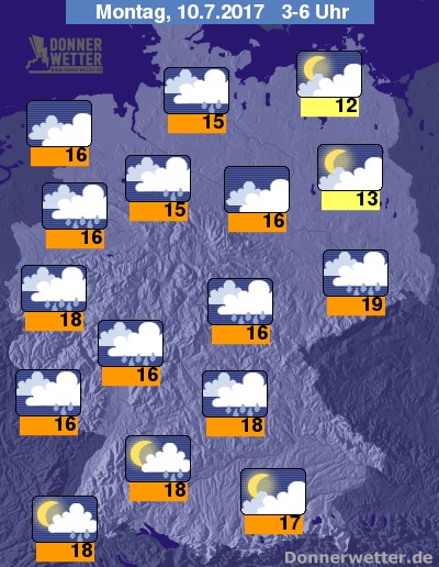 In der bevorstehenden Nacht ziehen meist kompakte Wolken übers Land hinweg, im Nordosten bleibt es bis zum Morgen dagegen noch meist locker oder aufgelockert bewölkt und dazu trocken, sonst muss jedoch wiederholt mit Schauern und auch einzelnen Gewittern gerechnet werden. Die Temperatur sinkt auf milde Werte zwischen 19 Grad in Dresden und bis 12 Grad in Rostock.