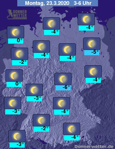 In der folgenden Nacht zeigt sich der Himmel über dem Land sternenklar, dazu bleibt es trocken. Die Temperatur sinkt auf teils 0 Grad entlang des Rheins und bis auf mäßig frostige -6 Grad im Thüringer Becken.