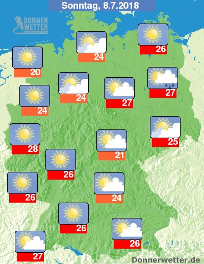 Am Sonntag ist es über den westlichen Landesteilen verbreitet sonnig. Im Osten ist es zum Teil heiter, teils ziehen aber auch dichtere Wolken durch, dabei bleibt es meist trocken, sonst ist es heiter bis wechselnd bewölkt und trocken. Die Temperatur steigt auf 20 Grad an der Nordseeküste und bis 28 Grad entland des Ober- und Mittelrheins.