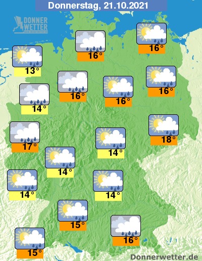 Am Donnerstag zeigen sich zum Teil Aufheiterungen, oft ziehen aber auch dichte Wolken durch, dabei bilden sich gebietsweise, teils kräftige Schauer. Die Temperatur steigt auf 13 Grad im nördlichen Emsland und bis 18 Grad in der Lausitz. Es weht ein starker und oft auch stürmischer Wind, an den Küsten und auf den Bergen herrscht zum Großteil Sturm.