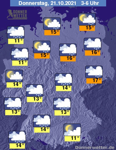 In der Nacht zum Donnerstag ziehen größtenteils dichte Wolken durch, dazwischen kann es auch mal etwas auflockern. Es bilden sich wiederholt, teils kräftige Schauer. Im Nordwesten sind zudem Gewitter möglich. Die Temperatur sinkt auf 17 Grad in Dresden und bis 11 Grad in Münster. Es weht ein starker, verbreitet auch stürmischer Wind. An den Küsten und auf den Bergen herrscht Sturm.
