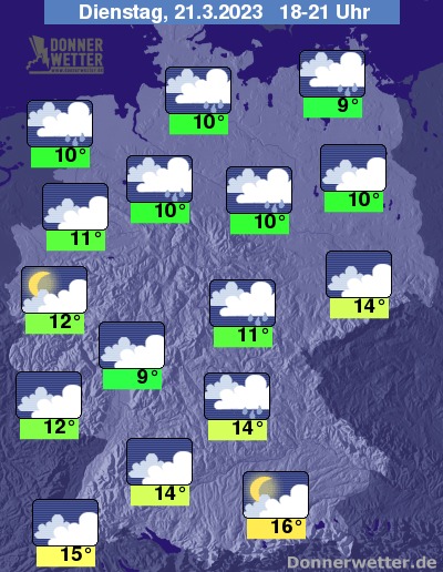 In den späteren Abendstunden ziehen die Regengebiete ost-/südostwärts weiter, so dass in der ersten Nachthälfte vor allem zwischen Ostseeküste und Franken zeitweise mit Niederschlägen zu rechnen ist. Im Westen und Südwesten gibt es in den nächsten Stunden lokal Wolkenlücken, sonst bleibt der Himmel meist bedeckt.