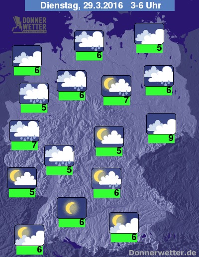 Am Dienstag halten sich vor allem im Norden meist dichte Wolken aus denen immer wieder Regen fällt, aber auch sonst ist es oft stark, gebietsweise jedoch auch aufgelockert bewölkt, dabei bilden sich einzelne Schauer. Die Temperatur steigt auf 10 Grad im Thüringer Becken und bis 14 Grad in München.
