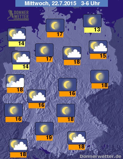 In der folgenden Nacht bleibt der Himmel häufig sternenklar, vor allem in den westlichen Bundesländern ziehen aber auch lockere Wolkenfelder durch, dabei bleibt es trocken. Die Temperatur sinkt auf 19 Grad in Stuttgart und bis etwa 13 Grad an der Mecklenburger Seenplatte.