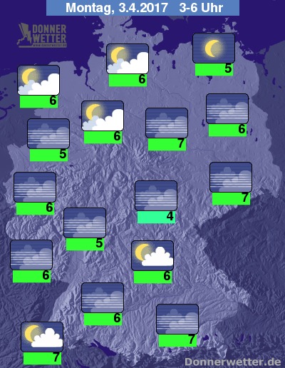 In der folgenden Nacht klingen letzte Schauer im Süden ab und nach und nach lockert es auch hier immer weiter auf. In den anderen Landesteilen ist es anfangs schon meist sternenklar und bleibt es auch bis zum Morgen. Einige Wolkenfelder sind allerdings im Nordwesten Deutschlands zu erwarten. Es bleibt trocken bei recht einheitlichen Tiefstwerten von 7 bis 4 Grad.