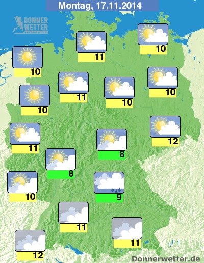 Der Start in die neue Woche ist deutlich freundlicher als das vorhergehende Wochenende, denn es bleibt nicht nur weitgehend trocken, sondern die Sonne kommt auch wieder häufiger zum Vorschein. So muss der Süden noch mit oft vielen Wolken vorliebnehmen, ansonsten kann sich zwischen den Wolken aber immer wieder die Sonne zeigen. Vor allem im Nordwesten, aber gebietsweise auch im Westen und Norden ist es zeitweise sonnig. Die Temperatur steigt auf 8 bis 10 Grad.