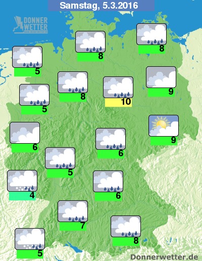 Heute halten sich praktisch bundesweit dichte Wolken, nur im Osten lockert die Bewölkung auch mal gebietsweise auf und nach Osten hin bleibt es tagsüber auch meist trocken, im übrigen Land fällt hingegen zeitweise Regen. Die Temperatur steigt auf 4 Grad im Saargau und bis zu 10 Grad in Magdeburg.