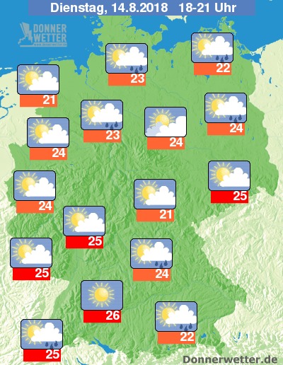 Heute Abend bilden sich über dem Norden und dem Alpenvorland noch einzelne Schauer, selten auch Gewitter, sonst klingen letzte Schauer rasch ab und di Sonne kann sich zum Großteil zeigen. Die Temperatur liegt bei 21 Grad in Cuxhaven und etwa 26 Grad in Stuttgart.