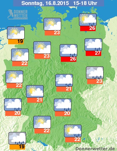 Am Sonntag ist es hier und da aufgelockert, oft jedoch auch stark bewölkt und es fällt zeitweise Regen, dabei steigen die Temperaturen auf kühle 17 Grad am Alpenrand und bis 27 Grad in der Niederlausitz.