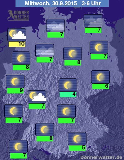 In der folgenden Nacht ziehen über den Norden anfangs noch einige, meist lockere Wolken hinweg, der Himmel klart hier jedoch zunehmend auf. In den anderen Landesteilen ist es zuvor schon sternenklar, dazu bleibt es landesweit trocken. Die Temperatur sinkt auf 10 Grad an der Nordseeküste und bis etwa 4 Grad in Oberfranken.