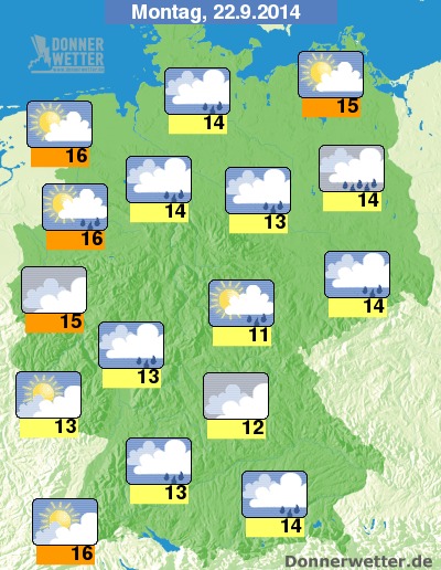 Die neue Woche startet für die meisten von uns eher trüb und nass, dabei bilden sich verbreitet einzelne Schauer, im Nordwesten wird es im Tagesverlauf freundlicher und ab dem Nachmittag auch meist trocken, in den übrigen Landesteilen muss bei wechselnder bis starker Bewölkung jedoch mit weiteren Schauern gerechnet werden. Die Temperatur steigt nur noch auf kühle 11 Grad um Bad Lobenstein und ebenfalls herbstliche 16 Grad enlang der Ems.