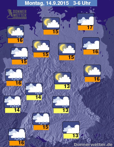 In der folgenden Nacht ziehen von Südwesten her kompakte Regenwolken herein, die sich bis zum Morgen etwa die gesamte Südwesthälfte der Republik erfassen, dabei fällt gebietsweise langanhaltender und ergiebiger Regen. Weiter nach Norden und Osten ist es hingegen weitgehend locker bis aufgelockert, und nur hier und da auch stark bewölkt, dabei bleibt es trocken. Die Temperatur sinkt auf 17 Grad in Rostock und bis 13 Grad in der Oberpfalz.