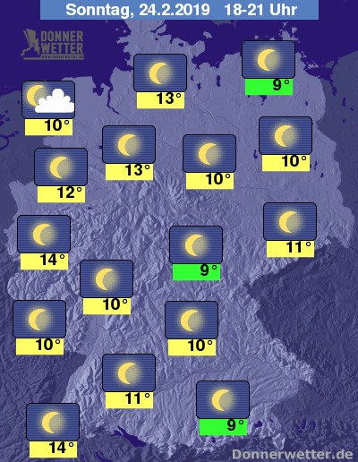 Heute Abend ist es überwiegend sternenklar und Wolken zeigen sich nur selten, dazu bleibt es trocken. Die Temperatur liegt bei milden 9 Grad in Rostock und noch vorfrühlingshaften 14 Grad in Freiburg.