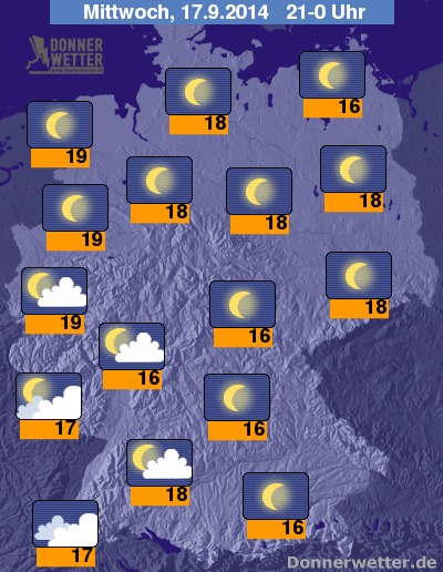 In der Nacht zum Donnerstag bleibt es in der Nordhälfte des Landes zumeist sternenklar. Im Süden, besonders nach Südwesten hin ziehen aber zunehmend dichtere Wolken auf und es können sich vereinzelt Schauer und Gewitter bilden, sonst bleibt es aber trocken. Stellenweise bildet sich Nebel oder Dunst. Die Temperatur sinkt auf 15 Grad in Schwaben und 10 Grad im Frankenwald.