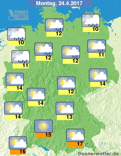 Die neue Woche startet insbesonders im Süden Deutschlands sehr freundlich mit viel Sonnenschein und wenigen Wolken. Gleichzeitig ziehen über den Norden Deutschlands dichte Regenwolken herein und die Sonne zeigt sich hier nur gelegentlich. Im übrigen Bundesgebiet ist es teils locker, teils stark bewölkt, aber weitgehend trocken. Die Temperatur steigt auf frische 10 Grad an den Küsten und bis 17 Grd in München.