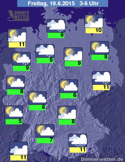 In der Nacht zum Freitag ist es sowohl im Alpenvorland als auch im Norden des Landes überwiegend stark bewölkt und es fällt zeitweise, im Norden gebietsweise Regen. Auch in Sachsen kann es bei dichten Wolken zeitweise regnen. In den übrigen Landesteilen zeigt sich der Himmel dagegen meist leicht oder aufgelockert bewölkt und es bleibt trocken. Die Temperatur sinkt auf 11 Grad am Bodensee und etwa 5 Grad am Pfälzer Wald.