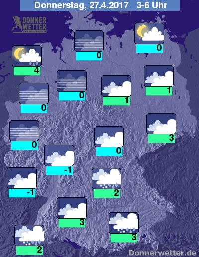 In der folgenden Nacht bringen kompakte Wolken dem Süden weitere Regen-, Schneeregen.- und Schneefälle, dazu kann es stellenweise glatt auf den Straßen werden! Meist sternenklar zeigt sich der Himmel vom Westen bis in den Norden. Nur direkt an der Nordsee sind vereinzelt auch Schauer unterwegs. Im restlichen Bundesgebiet ist es stark bewölkt, jedoch trocken. Die Temperatur sinkt auf 4 Grad in Emden und bis -1 Grad am Westerwald.