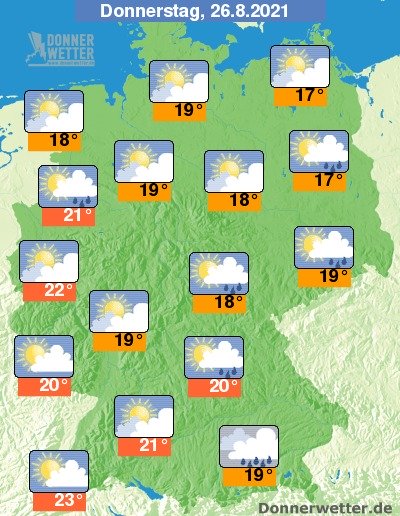 Am Donnerstag ist es im Süden und Westen oft heiter, hier und da ziehen jedoch auch dichte Wolken durch und es bilden sich vereinzelte Schauer. Im Rest des Landes ist es aufgelockert bis stark bewölkt, dabei bilden sich gebietsweise Schauer. Die Temperatur steigt auf 17 Grad an der Müritz und bis 23 Grad am Oberrhein.