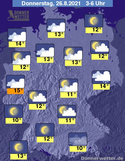 In der Nacht zum Donnerstag ist es in einem breiten Streifen von Niedersachsen und NRW bis nach Sachsen meist stark, teils aufgelockert bewölkt, dazu können sich über Sachsen einzelne Schauer bilden, sonst sind nur selten Schauer möglich. Über dem übrigen Land ist der Himmel hingegen meist locker bewölkt oder sternenklar, dazu bleibt es trocken. Die Temperatur sinkt auf 15 Grad in Köln und bis 10 Grad in München.