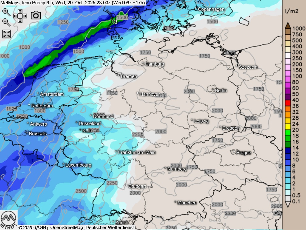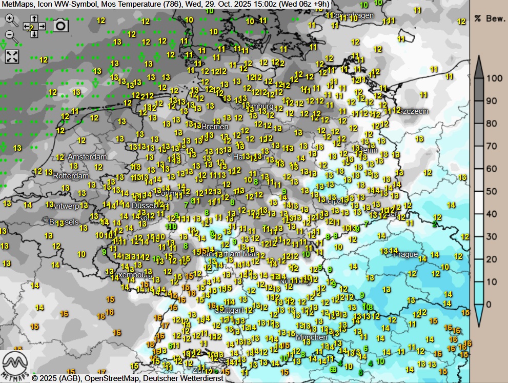 Die Wetter- und Temperaturkarte für Mittwochnachmittag (15:00 Uhr) sowie die Sechs-Stunden-Regenmengen bis 23:00 Uhr nach Icon: