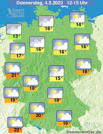Heute Nachmittag ist das Wetter vor allem im Süden und Osten oft heiter, sonst ziehen jedoch schon oft einige und vor allem im Norden auch teils dichte Wolken durch. Es bleibt überall trocken bei 13 Grad an der Nordsee und bis 22 Grad am Oberrhein.