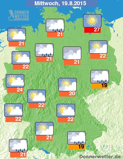 Im Westlichen Teil der Republik wird das Wetter heiter. Im Südlichen Teil der Regionen Oberbayern und Freiburg (Bodensee), ziehen starke Regenwolken auf. An der Nordseeküste und der Sächsischen Schweiz ist ebenfalls Regen vorhergesagt. An der Ostseeküste ist ein klarer Himmel in Sicht mit schönem Sonnenschein. Die Temperaturen steigen von 19 Grad C bis hin zu 27 Grad C.